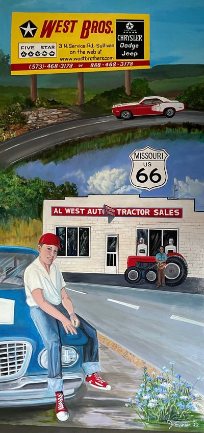 The first dealership was started in the early 1940’s by my Grandfather, Al West Sr. In Cuba, Missouri on Route 66. This dealership was Al West Motor and Tractor Sales. My father, Al West, Jr. joined my Grandfather in the business after he returned from a tour of duty in the Merchant Marines. My Aunt Rose also joined them in the business. My Dad bought the dealership from my Grandfather when he retired for health reasons. My brothers and I worked at the dealership from the time we were 10 years old and you can see in the mural that I had the difficult job of sitting on the fender of a Plymouth Valiant. The business remained at the same location on Route 66 in Cuba until my Dad sold it to his cousin Don Treece. My Dad had purchased a dealership in Rolla and moved our family there.